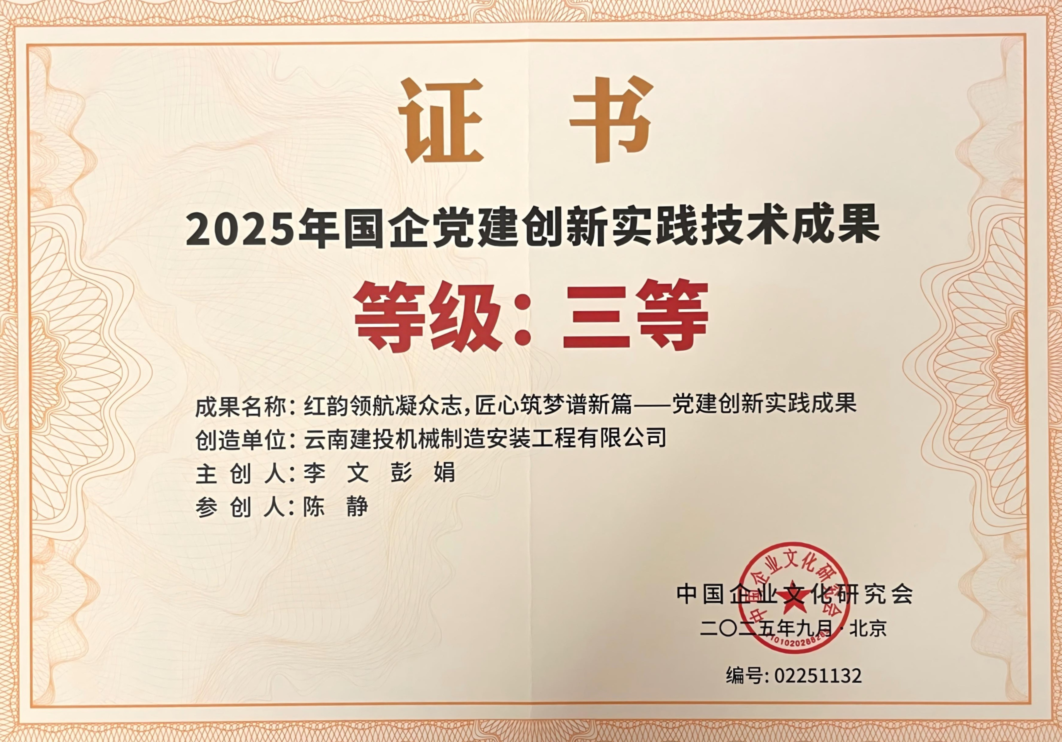 近日,中国企业文化研究会公布2025年国企党建创新实践技术成果评选结果,公司《红韵领航凝众志,匠心筑梦谱新篇》被评定为三等成果。公司党委将以此次获评为契机,持续深化党建创新实践,认真总结提炼优秀经验做法,推动党建工作全面提质增效,切实将党建工作成效转化为企业发展实效,为公司内涵式高质量发展提供坚强保证。【记者:张萍、张
